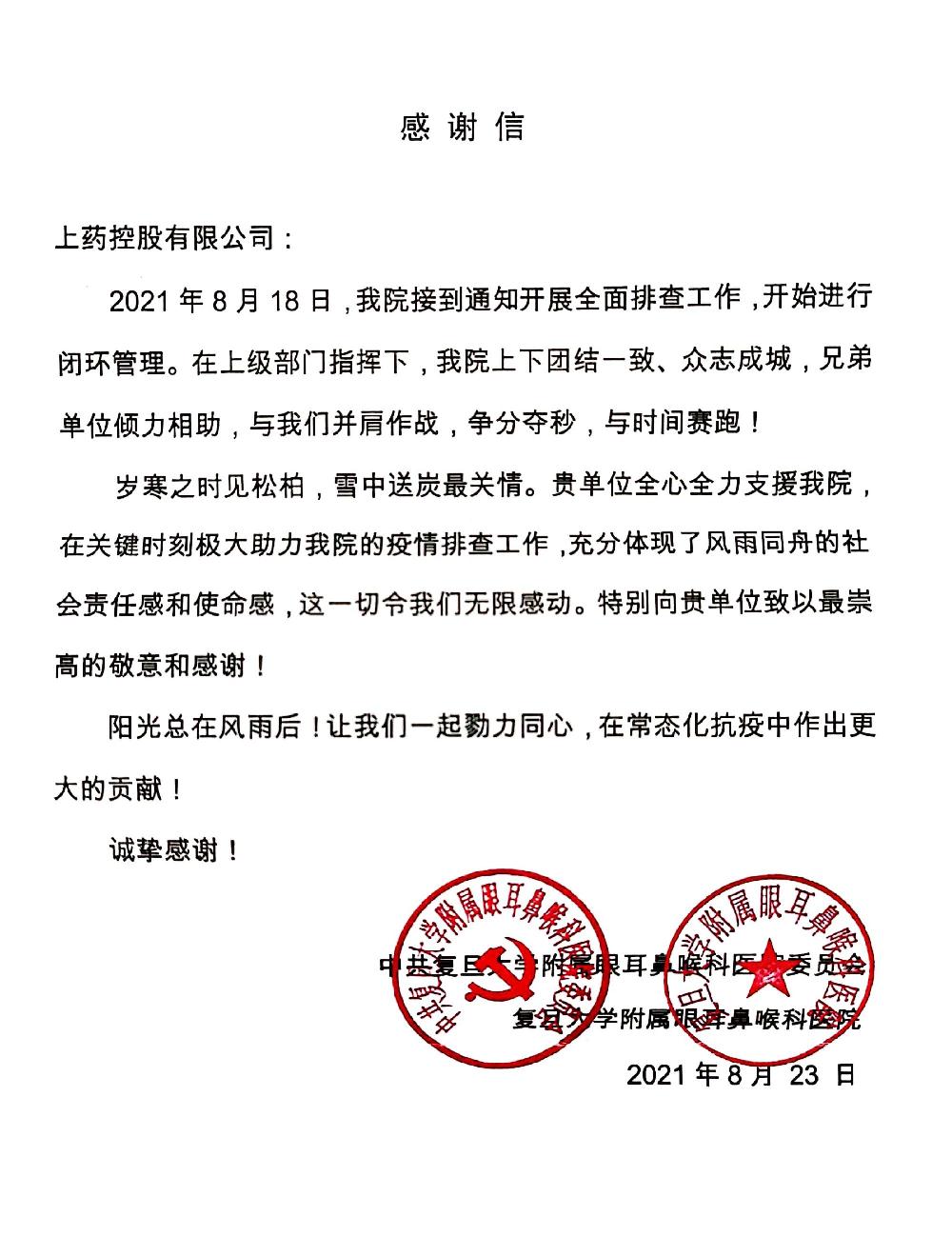 8月19日,眼耳鼻喉科醫(yī)院通過(guò)對(duì)口服務(wù)的銷售代表向上藥控股傳達(dá)了用藥的需求。接到通知后,上藥控股快速響應(yīng)、積極行動(dòng),上藥控股全國(guó)運(yùn)營(yíng)管理中心協(xié)同上藥物流、上海業(yè)務(wù)總部等各相關(guān)部門及時(shí)啟動(dòng)緊急預(yù)案,從開(kāi)單、配送、與醫(yī)院交接,所有流程加快作業(yè),開(kāi)辟綠色通道。事后,復(fù)旦大學(xué)附屬眼耳鼻喉科醫(yī)院寄來(lái)了感謝信,對(duì)上藥控股在關(guān)鍵時(shí)刻出色完成藥品保供任務(wù),全力支持醫(yī)院的疫情排查工作表達(dá)了敬意和感謝。