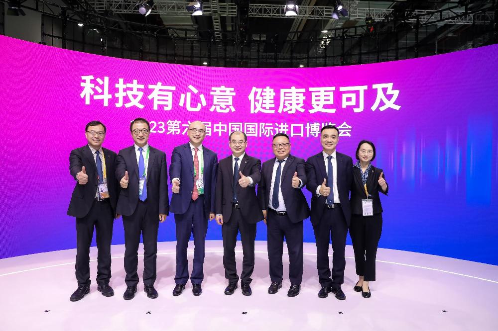 2023年11月7日,中國上海,第六屆進(jìn)博會(huì)期間,雅培新品芬悅寧正式亮相,上海醫(yī)藥將作為該款新藥的進(jìn)口總經(jīng)銷商,幫助中國患者提高對該藥物的可及性。雅培藥品業(yè)務(wù)部門副總裁兼中國區(qū)總經(jīng)理湯興斌,上海醫(yī)藥執(zhí)行董事兼執(zhí)行總裁李永忠及雙方管理團(tuán)隊(duì)出席發(fā)布會(huì)現(xiàn)場,共同見證芬悅寧中國首秀。